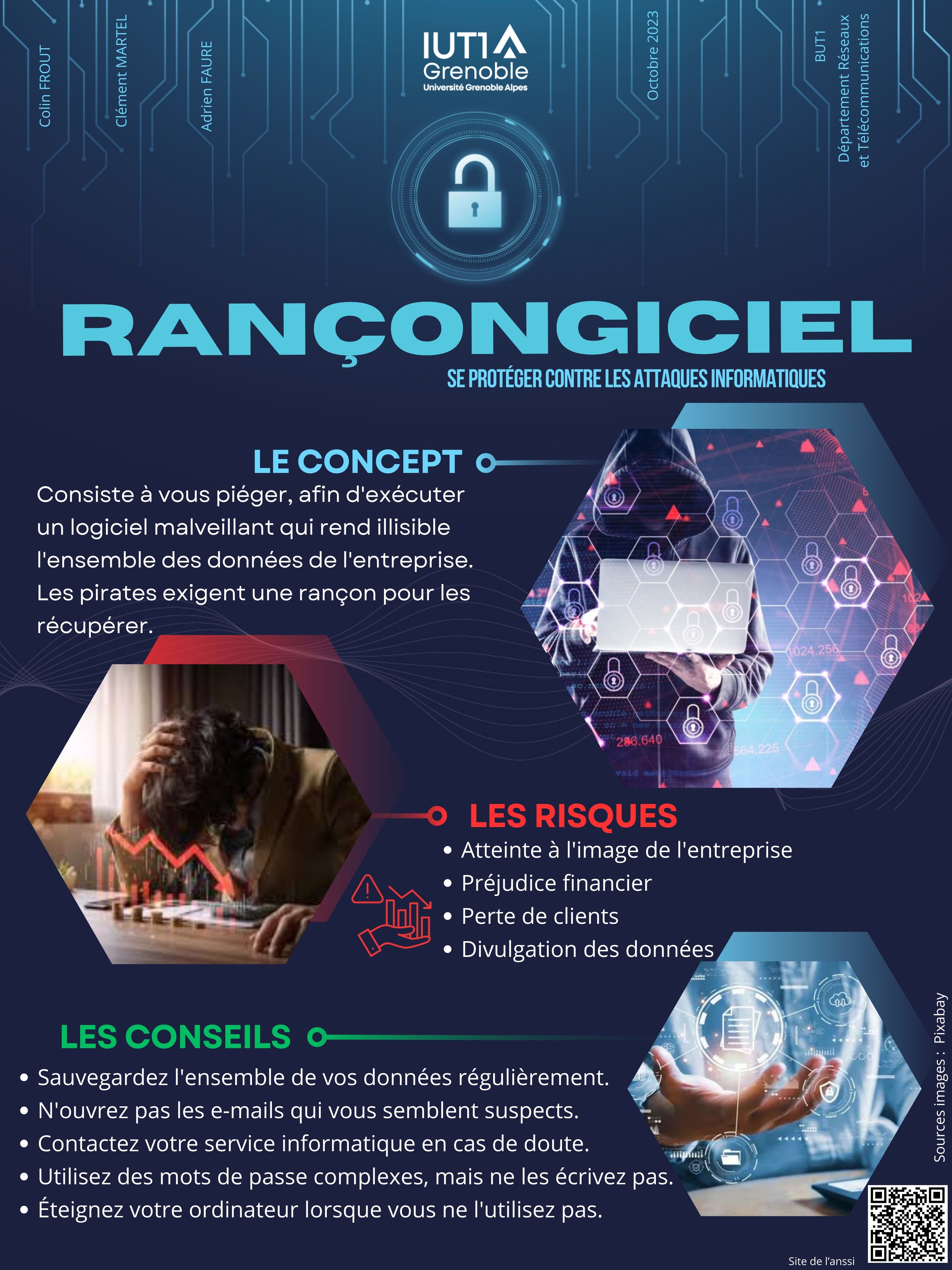 Projet réalisé en groupe de trois pour concevoir une affiche de sensibilisation aux cybermenaces, destinée aux utilisateurs d'une entreprise avec des pratiques de protection quotidiennes.